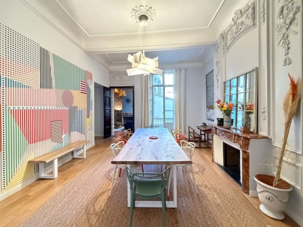 Typical Ecusson apartment with preserved character...Located in a beautiful condominium just steps from Place de la Canourgue, this superb 5-room apartment offers 169 m² of living space. Upon entering, an exceptional reception area leads to a vast dining room adorned with moldings and a fireplace. The living room, clad in antique terracotta tiles, and the kitchen with painted cement tiles enhance the charm of this unique space, highlighted by its exposed stone walls. Three beautiful bedrooms, two of which have their own private bathrooms, are featured.