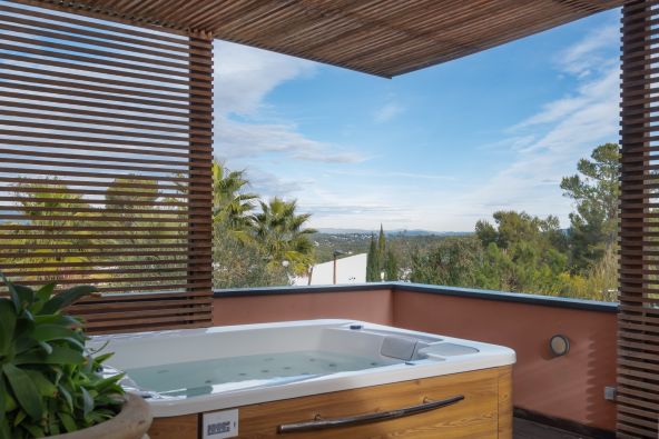 Another terrace area features a jacuzzi with breathtaking views of Pic Saint-Loup.